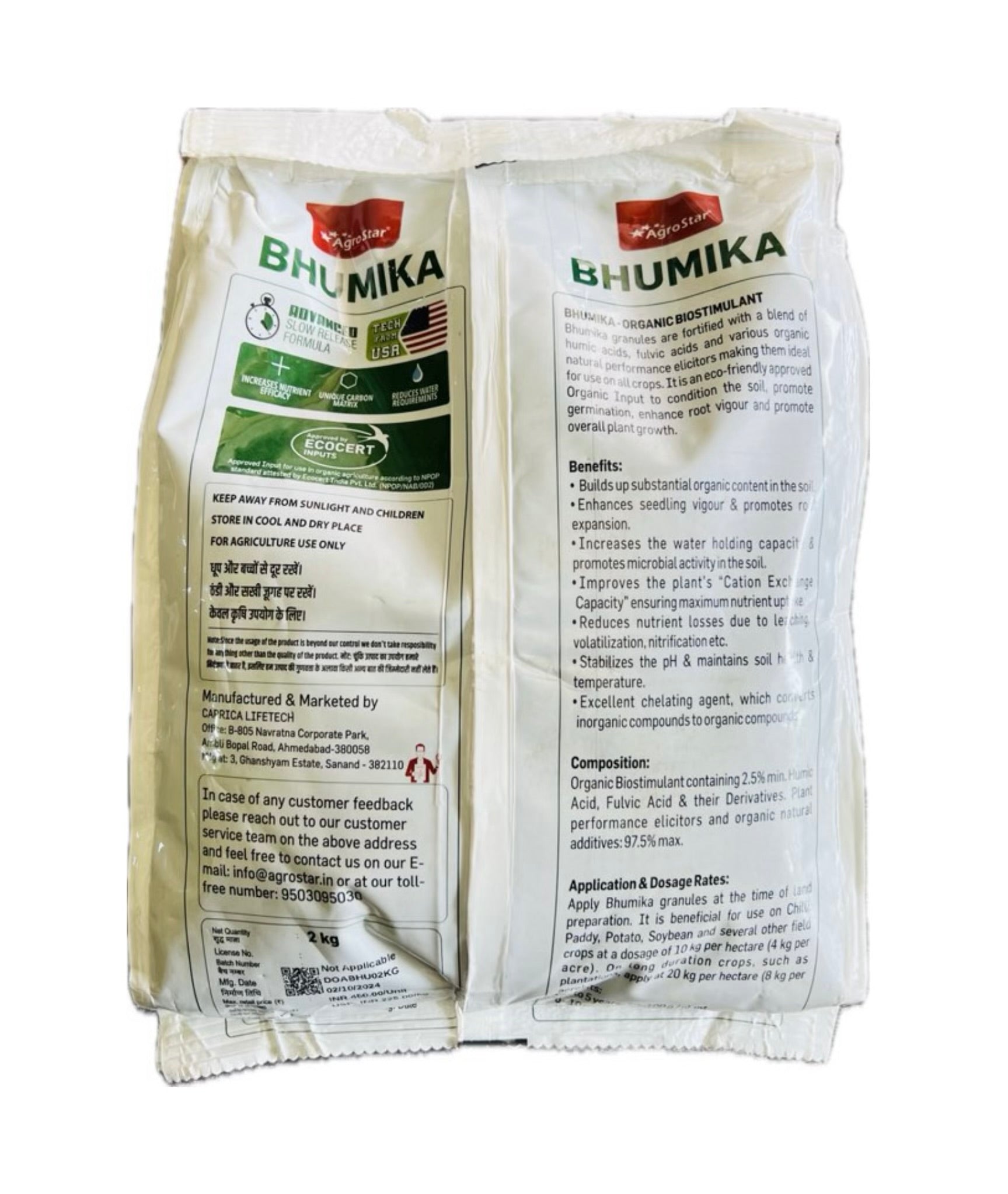 Bhumika Organic Biostimulant Granules by AgroStar is a premium humic acid and fulvic acid–based soil conditioner designed to improve soil fertility and crop productivity. Enriched with organic performance elicitors, Bhumika enhances root development, nutrient uptake, microbial activity, and overall plant growth. It is suitable for all crops and supports sustainable and organic farming practices.